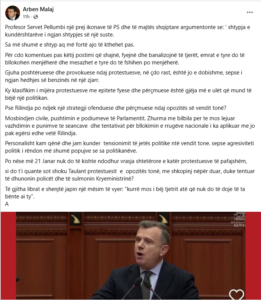 Ish-ministri i Financave Arben Malaj ka reaguar ashpër pas deklaratave të kreut të grupit parlamentar të Partisë Socialiste, Taulant Balla, i cili nga foltorja e Kuvendit i cilësoi protestuesit e opozitës si lapanjozë. Sipas Malajt, një gjuhë e tillë është poshtëruese, provokuese dhe e dëmshme për klimën politike në vend.