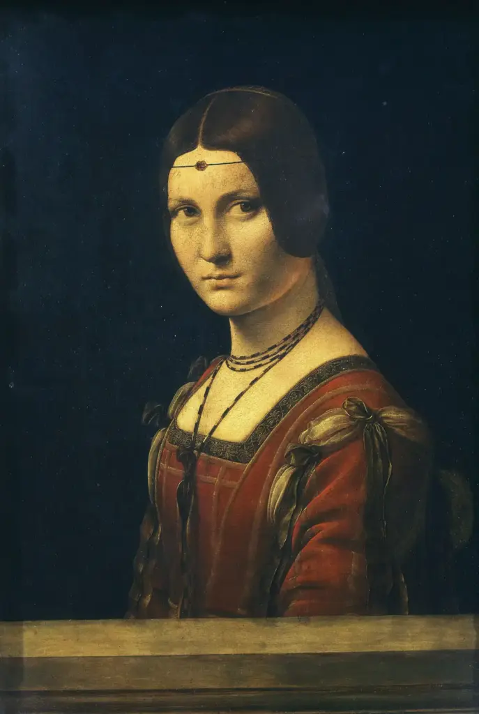 Pas një dekade, Leonardo realizoi Damen me hermelinën, portretin e Cecilia Galleranit, dashnore e dukës së Milanos, Ludoviko Sforza. Vajza e re, e bukur dhe inteligjente, mban në krahë një hermelin, simbol i pastërtisë, por edhe aludim për vetë dukën, që mbante nofkën “Il Moro”. Këtu, Leonardo eksperimentoi me lëvizjen, me kontrastin e butë të shikimeve dhe me një buzëqeshje të lehtë që do të përkryhej më vonë në Giocondën.