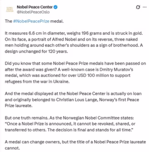 Në një mesazh publik, Komiteti Nobel theksoi se çmimet e tij nuk mund të transferohen, ndahen apo t’i kalohen një personi tjetër, duke rikujtuar rregullin zyrtar se statusi i laureatit është i pandryshueshëm dhe përfundimtar. Sipas deklaratës, edhe nëse një medalje fizike mund të ndryshojë pronar, titulli i fituesit të Çmimit Nobel të Paqes nuk mund të kalojë te askush tjetër.