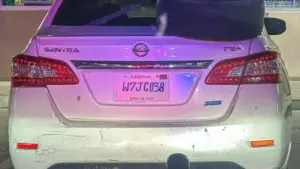 Në vend të targës standarde të lëshuar nga shteti, drejtuesja kishte vendosur një version artizanal, të shkruar me dorë dhe të ngjitur në pjesën e pasme të mjetit. Targa përmbante edhe numrin identifikues të automjetit, si dhe mbishkrimin California, duke imituar pamjen e një targe origjinale. Megjithatë, detajet nuk ishin të plota dhe disa elementë rezultonin të improvizuar.